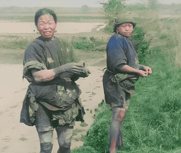 两位女子刚从泥田里上岸,腿上糊着黏稠的淤,笑的那位牙白得很,另一位把嘴抿着不说话,腰间的布绳系得死,袖子浸到肘上,指尖一搓泥团掉下去“吧嗒”一声,那时候一天忙下来背就直不起来,现在机器下田,人站在田埂上看两眼就行,泥味还在,力气换了方向。