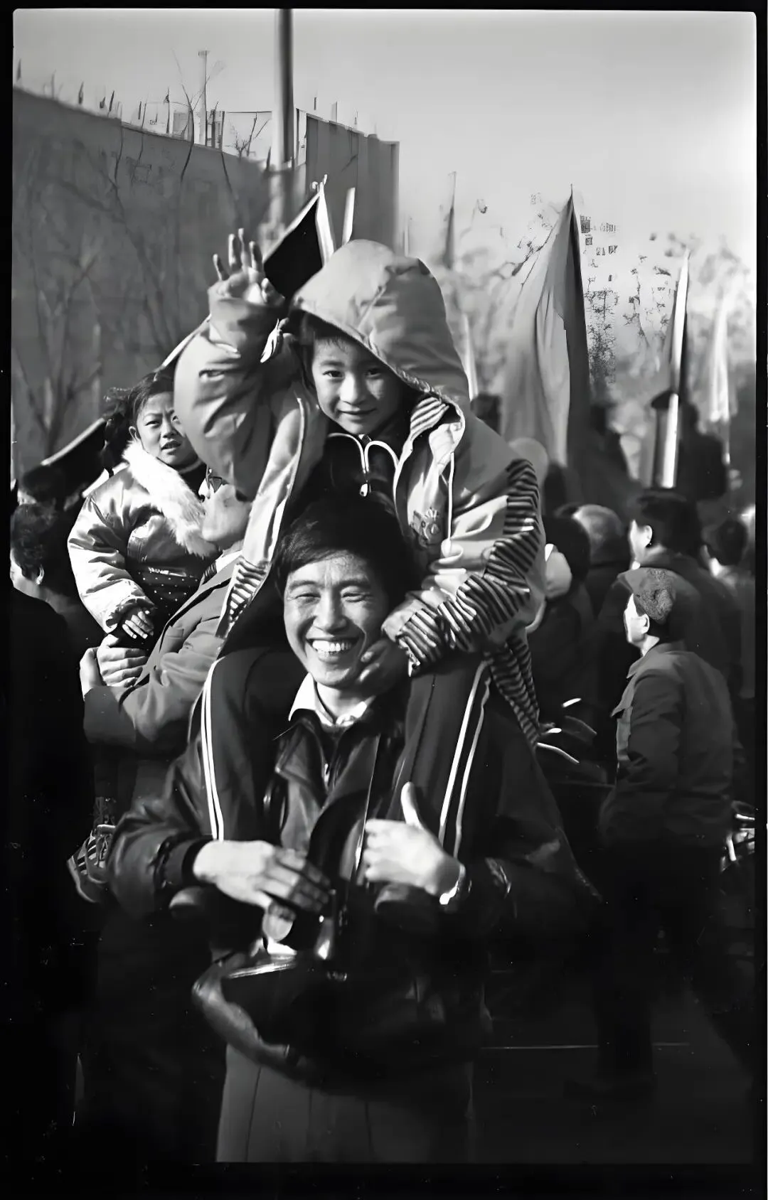 这次的拍摄,不是猎奇般的抓拍,也不是隐蔽式的偷拍,而是熟人之间在热闹场合偶遇,最自然不过的、“打招呼”式的拍摄。我按下快门的一瞬间,田先生本能地挺了挺腰杆,儿子的重心有些后坠,他赶紧用双手护牢儿子的双腿。在高处的儿子稳住了重心后,很有礼貌地向我招手致意。背景是攒动的人头,和一张张模糊却洋溢着喜气的面孔,构成了一幅生动的、九十年代北方小城春节惯有的图景。