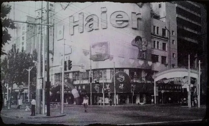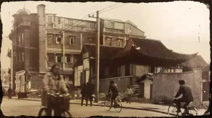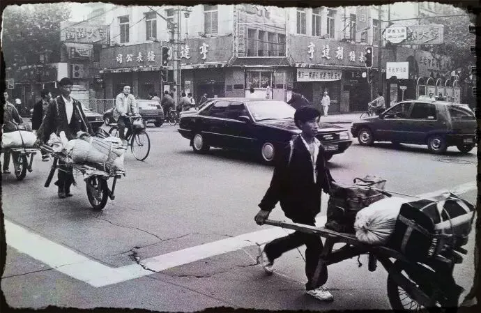 十字路口那边是亨达利钟表公司,近处几个推着独轮车的据说是安徽来上海的生意人。有段时间路上这种独轮车很多。