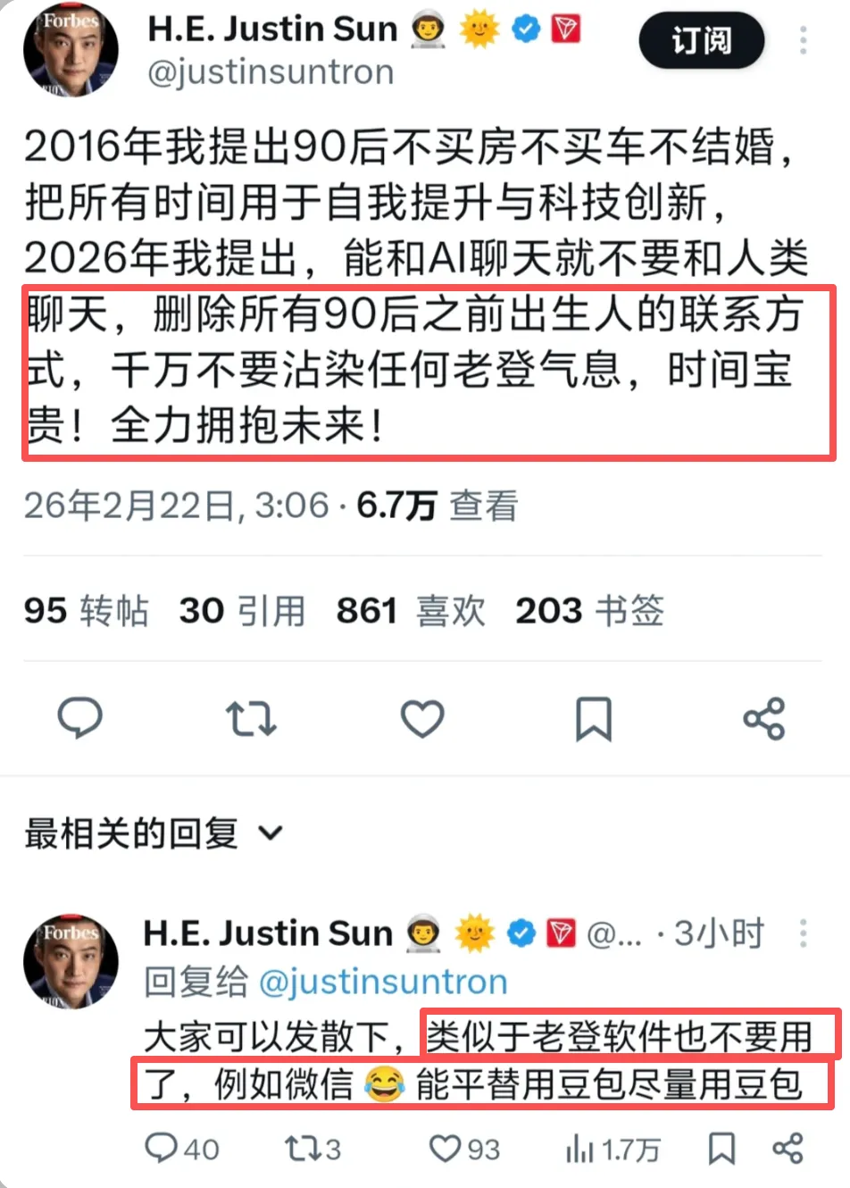 甚至还说,别用微信这种“老登软件”了,能平替就用豆包,主打一个全力拥抱未来!
