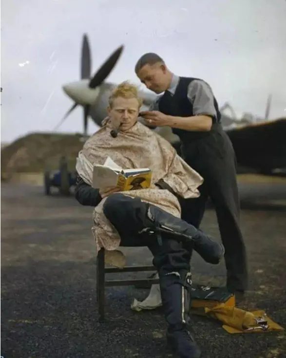 5.1942年,英国皇家空军飞行员在执行任务间隙理发。