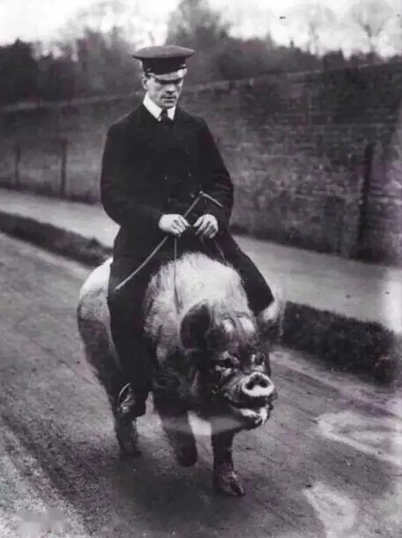 20.1903年的英国,一名男子骑着猪。