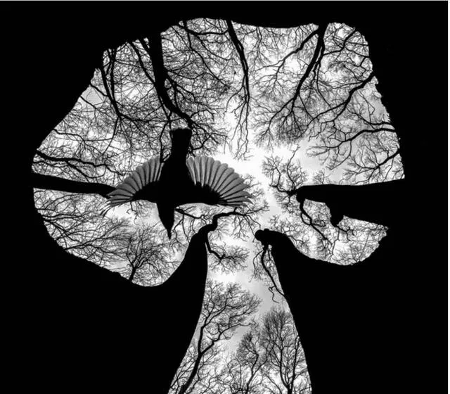 这张巧得很,树枝在天光里拼出个大象的轮廓,正中一只鸟翅膀铺开,像有人在说“别慌”,我第一次看这类构图还是在县文化馆的小展墙,站了好一会儿才看出来门道,摄影师的心眼儿真细,冬天秃枝子也能做画,过去的人拿筷子都会雕花,现在人拿影子也能说话。