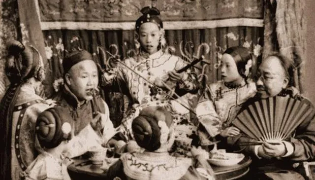 图里这一桌叫满式家宴,绸缎衣襟上滚着宽边儿,桌面高脚盘里糟肉热着气,三弦一拨,扇子一合,长辈慢声细语问学堂功课,孩子躲在屏风后偷笑,奶奶说她小的时候最怕把汤撒在袍子上,袖口一湿挨说一晚上,现在一家子围桌吃个热乎,衣服好洗,心也松快些。
