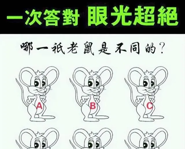 这是个找不同的小题,六只老鼠摆着同样的笑,耳朵和尾巴暗藏门道,我侄子做这类题比我快,他说眼睛要虚着看,别死盯一个点,以前我们拿小人书练眼力,现在给孩子一张练专注,玩笑里也能练心劲儿。