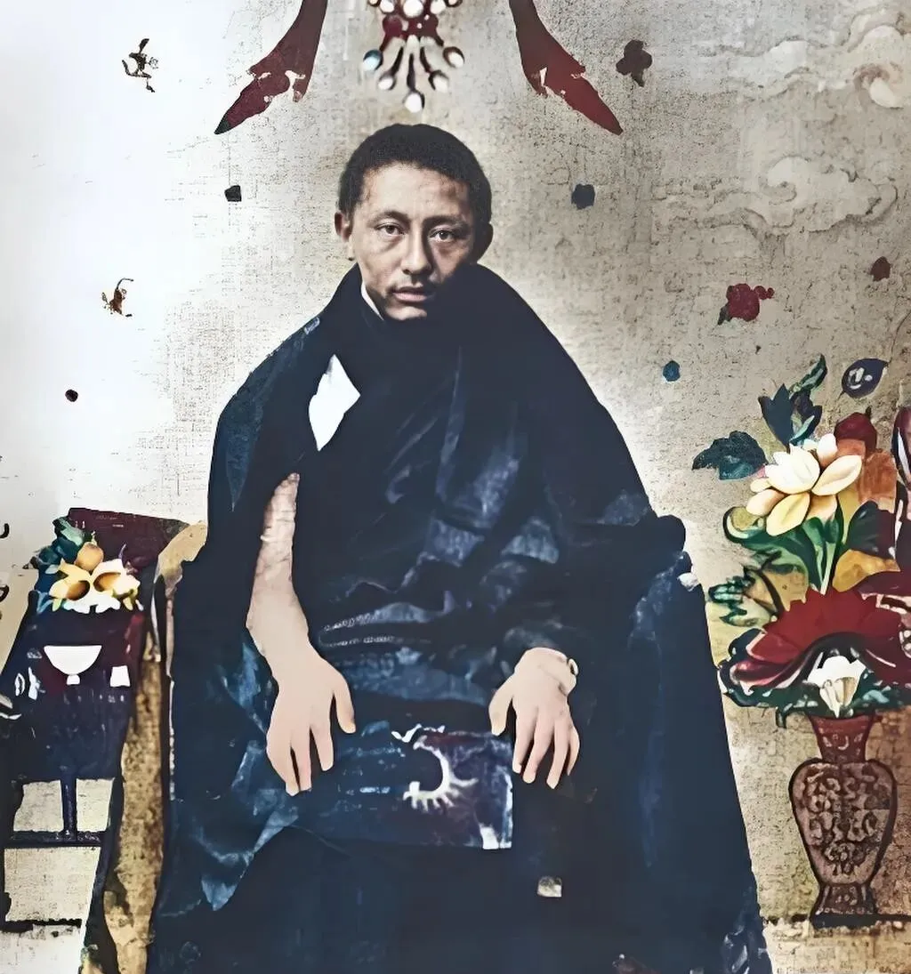 图中这位身披黑色袈裟的高僧叫九世班禅,画面里桌几上的果子与花瓶被上成了温润的赭与翠,衬得法袍更沉静,手背露在袖口外,骨节分明,像是刚做完一场冗长的法事才坐下歇口气,他的目光不躲不闪,安安稳稳看着镜头,像在说话却又什么都不必多说。
