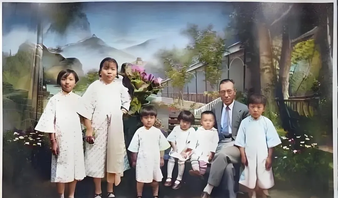 这个热闹的画面叫李佩全家合影,孩子们的衣裳都洗得发软,白里透青,老父亲坐在长椅边,西装领口笔挺,眼镜架得稳稳的,背景是影楼手绘的园景,树影和远山都不真,却把一家人衬得踏实极了。