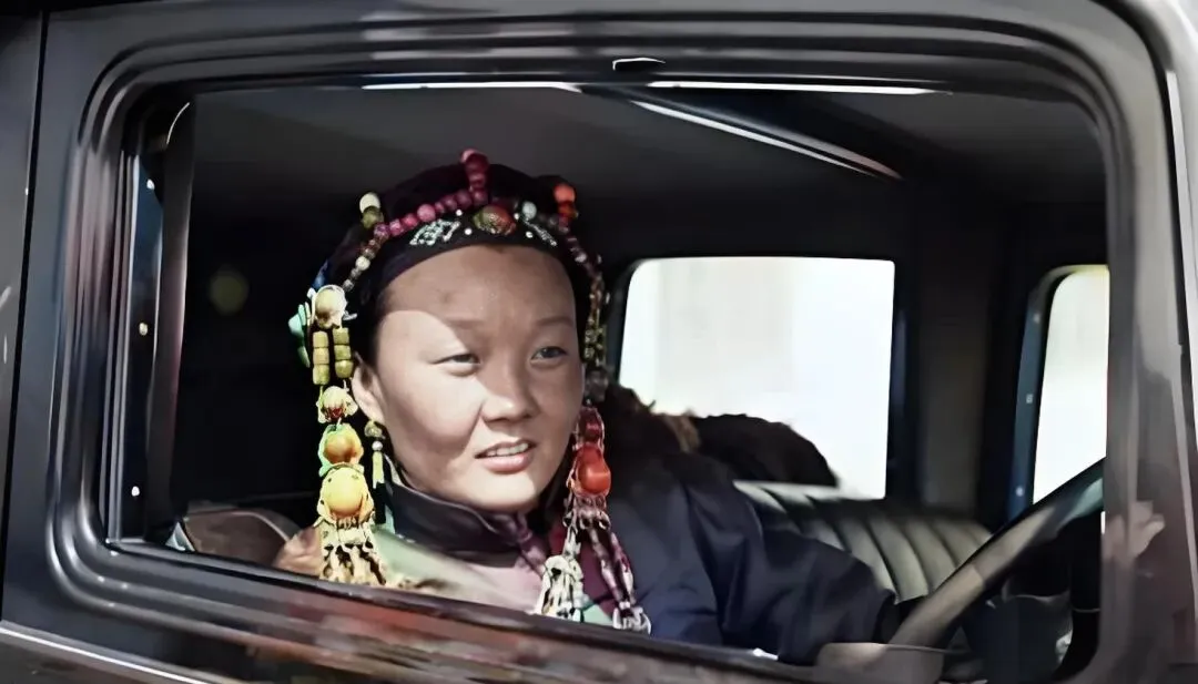 这个稳着方向盘的人叫蒙古族女贵族,头上的串珠一排一排压住鬓角,车窗框黑亮,像一根细铁线把她的笑意裹住了,眼睛是亮的,像刚学会打点火又忍不住想多试两回。