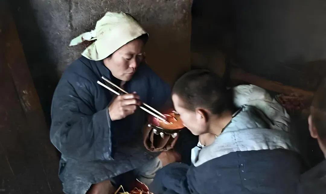 这个弯腰喂饭的身影叫照料伤员,粗瓷碗里的热气往上冒,筷子挑着菜尖,怕烫又不舍得吹得太凉,土墙的阴影把屋里围得紧紧的,像一只不合手的袖套,穿久了也就认命。