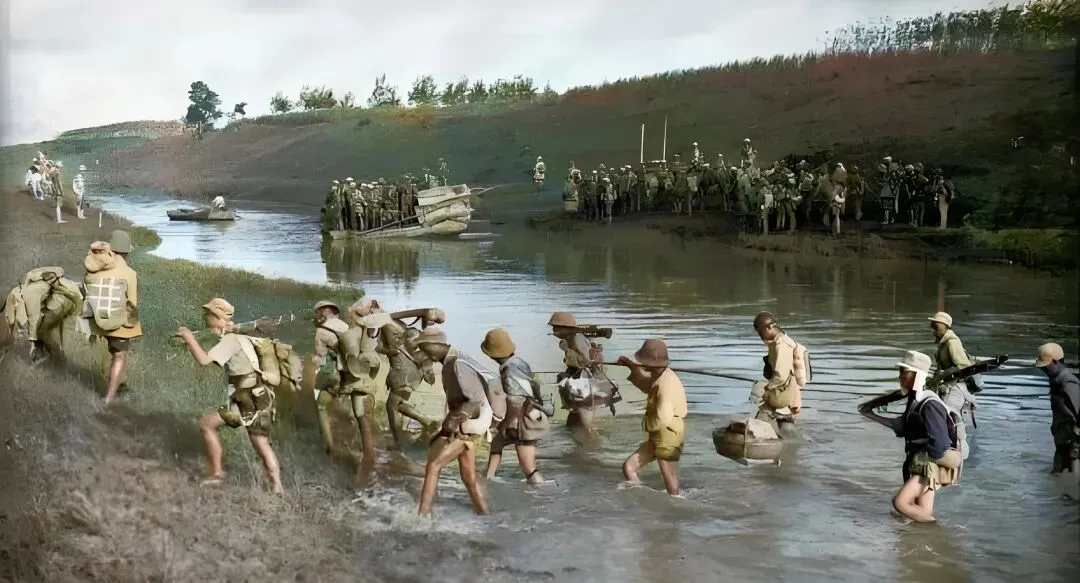 这队排在水里的身影叫北渡,裤腿挽到大腿,膝盖上的疤在日光里白一块黑一块,有人扛着木箱,有人抬着机枪,水面被搅成碎银,凉意透到脚腕骨上。