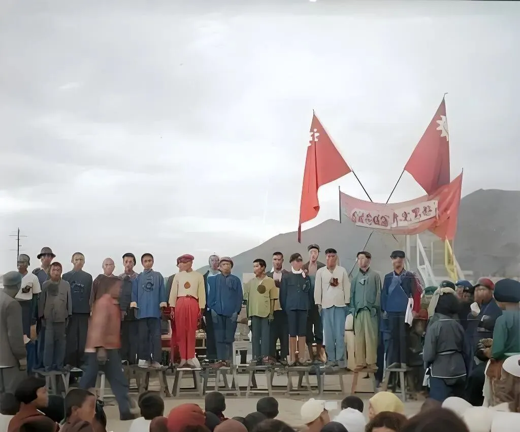 这排站在高凳上的人叫宣告,旗子交叉着挑在天里,布幔上的字歪歪斜斜,跟风跑,围观的人挤得密,帽檐把表情都压在阴影里了。