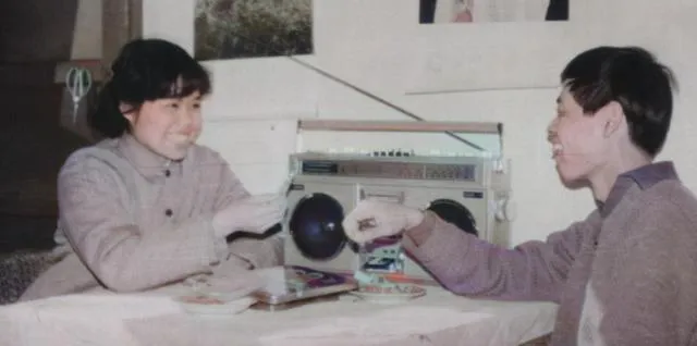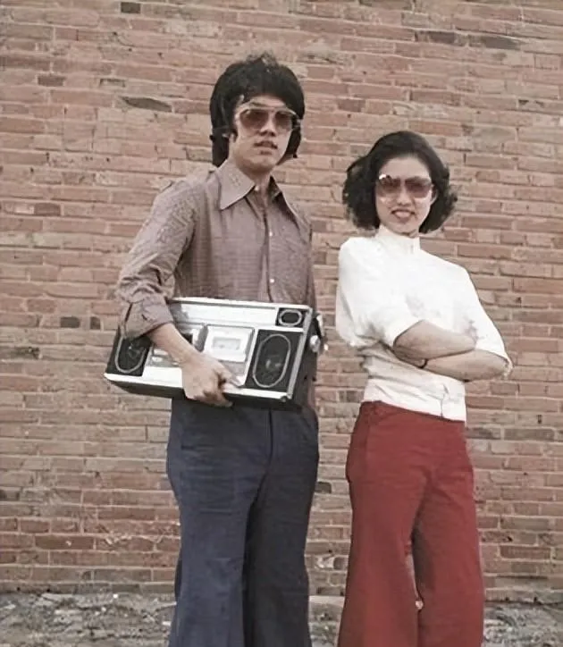 图里这对年轻人手里的大块头叫录放机,银灰外壳两边黑色喇叭眼子圆又亮,肩上一挎就有派头,裤腿喇叭口呼啦一下铺开,太阳镜一扣脸上立马就俏起来,我表哥当年借来一台放邓丽君的磁带,院子里人还没坐稳歌儿就先飘出去了,邻居敲墙让小点声,他偏把音量又拧了一格,说年轻嘛就该热闹点。