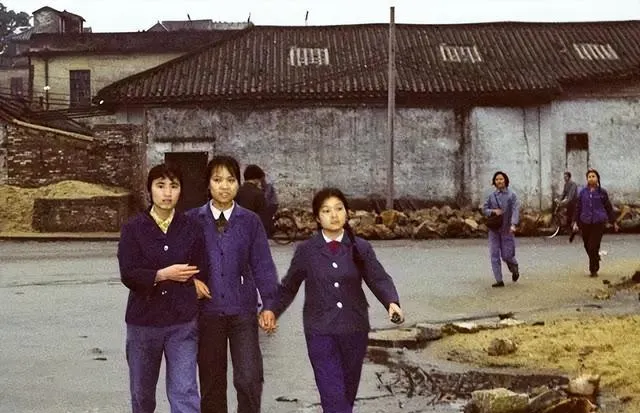 这个打扮叫蓝灰工作装,领口硬挺,扣子密密的,袖口一挽能看到白衬衣边,三位姑娘并排走,步子利落,照片里没啥花哨,干净耐看,我妈说那会儿衣服少,颜色也少,洗净晒干再穿就好,省心也省事。