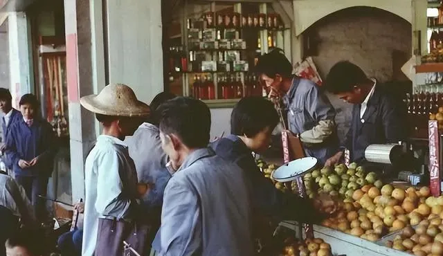 这场景叫供销社果摊,铁秤盘一晃一晃,梨和柑子堆成小山,柜台后的人手指按着算盘珠子,嘴里念着五毛三毛的,小时候跟着排队,攒了两张票和几角零钱,老板往纸里一兜,袋口打个死结,回家路上忍不住先掰开一个尝一口,酸甜在牙尖蹦一下,好吃极了。
