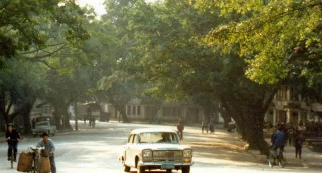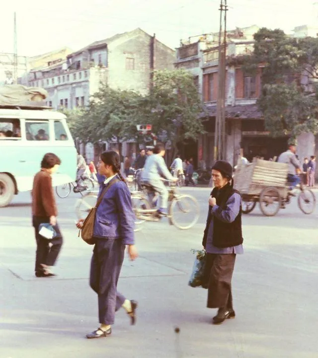 这张里头的交通混搭得很,前头大巴,后头二八大杠,自行车龙头上绑着绳子挂包,旁边人推着木板车,街口的红绿灯个头小,像个玩意儿似的,**以前车少路宽,走路不慌,**现在车多了眼睛都不够用。