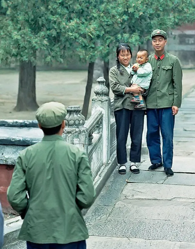图中这身叫绿呢军装,胸口兜子方方正正,帽沿压得低一点更精神,小孩被爸妈夹在中间,笑得露牙,外头风有点凉,妈妈的手把孩子背后档住,爸爸说快给我们照一张,回部队寄给姥姥看看,话音一落咔嚓一下装进底片里了。