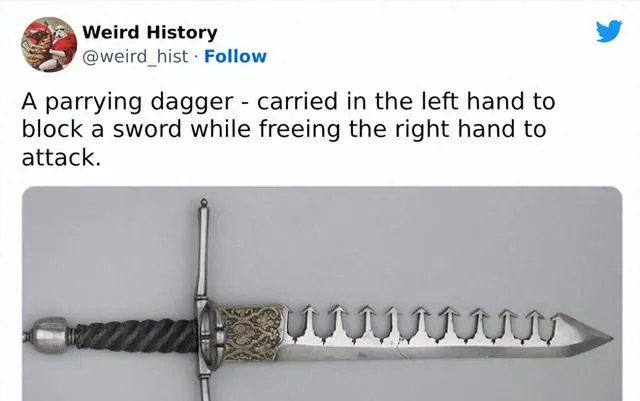 图中这把短刀叫挡剑匕首,柄上黑绳缠得紧,横护手伸出去像两只叉子,刀身开了几道卡齿,左手握着去挡,右手腾出来再出招,冷冽的金属在灯下发灰光,想象一下巷口的对峙,寒气先从指缝里冒出来。