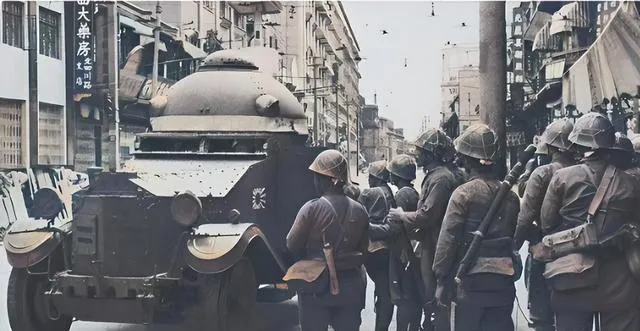 这个车叫装甲车,一伙士兵排队往上挤,街面两边店招还挂着,盔上的绑带在颈后打结,谁也不说话,铁壳子慢慢冒白气,脚底下的影子一条条拖过去,那时候上车就意味不一样,现在看像一堵会动的墙。