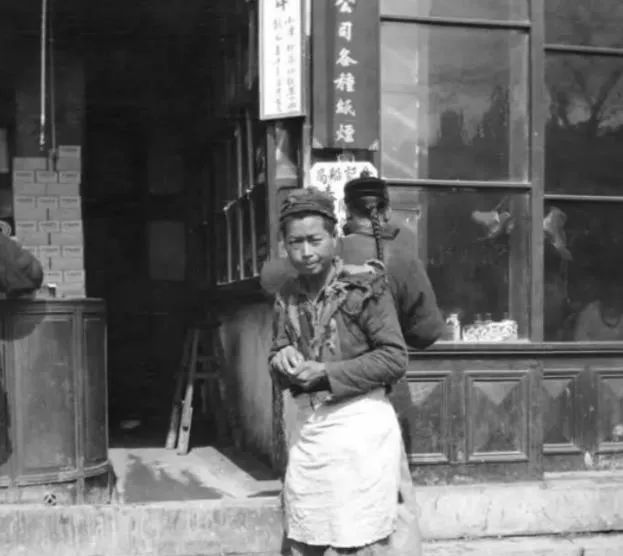 这个年轻人站在门口,是店铺学徒,围裙前襟油渍一块块,脑袋上包着抹布,木柜台里码着小纸盒,掌柜在后面清点账本,学徒眼里有股急劲儿,想把一天的手脚做利索,晚上收摊再溜到门板后面学两招。