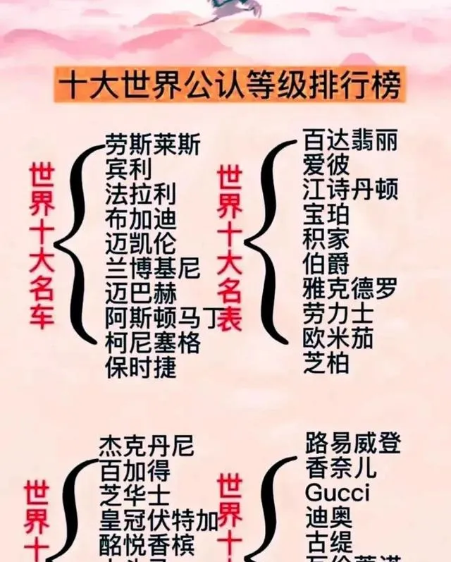 这张花里胡哨的排行榜海报,名字一串串排得密,像是要告诉你什么才算讲究,以前我们认牌子靠口口相传,谁谁戴过谁谁开过,现在一张图就给你排好队,真有用没有,得看兜里那点预算,它也就热闹个样子。
