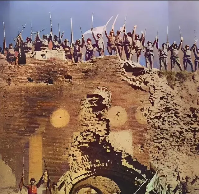 这张是破城墙上的队列,旗枪一排举起,砖缝里还掉着渣,脸上糊着尘土,太阳一照人影拉得老长,战事过去多年,影子却还挂在墙头,那时候一个号声能让大伙冲上去,现在我们在博物馆里抬头看讲解牌,脚下干净,心里也会咯噔一下。