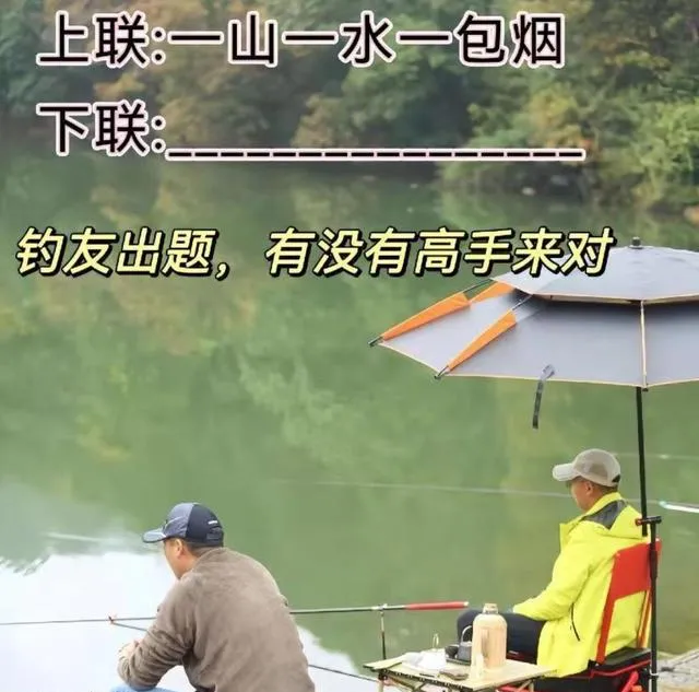 这一格像是摆谜的对联,湖边伞下一人持杆,一人理线,水面平得像镜子,上联一丢,钓友就等着下联,想起小时候墙根儿下写粉笔字,你一句我一句,谁对上了就赢一包话梅,如今手机里三两下就能对出十个,可当时那股小得意只有当面笑得出来。