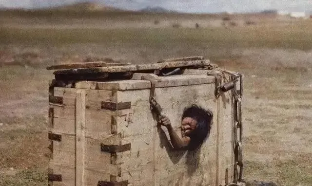 这个木箱子叫枷箱,边上铁链缠着,板缝里透风不多,脸从洞口探出来,眼神干得像砂子,我外公讲过乡间押解人的见闻,说人被关久了见到光会眯半天,这类照片看一眼就够,残酷两个字不用再解释了。