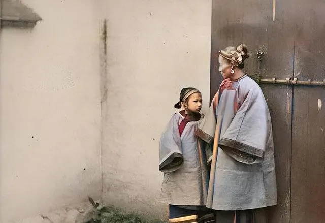 这两位穿着宽大的青褐色长衫,叫旗装母女,头上小簪子亮一下,靠着门边嘀咕,小姑娘眼神往上抬,像在问今天吃啥,母亲的手背遮着风,家门口这么一靠,半天就过去了,现在门禁滴一下,人一闪就进屋,巷口人情味淡了不少。