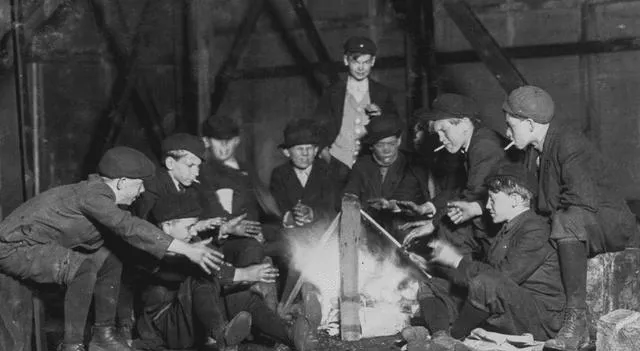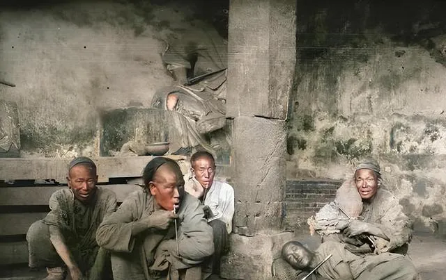 几个人靠在门洞边,衣裳破得像被风咬过,这叫沿街乞人,一个指着天说理,一人抱臂冷得发青,小时候我在集市边见过类似的情形,妈妈塞我一块饼说别看久了,人要帮但别拿人苦难当稀奇,现在街面整洁了,体面给了更多人,别忘了。
