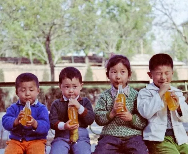 这四个小家伙正喝橘子汽水,玻璃瓶冰着,吸管一咬就扁,谁先咕嘟完谁就把瓶盖当金币带走,太阳打在瓶身上,金黄的,眼睛眯成一条缝,甜得发腻也舍不得慢,现在饮料名头多,味儿却记不住。