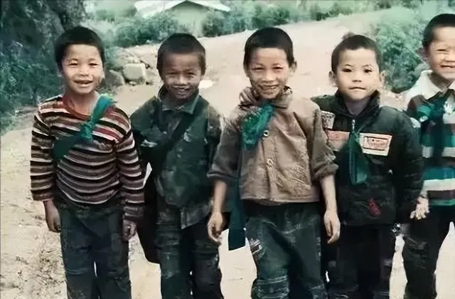 这几位小伙伴胸前别着红领巾扣,袖口磨起毛边,笑得露出一排小牙,衣兜里鼓鼓囊囊,手里攥着什么宝贝不肯亮,放学结伴从坡上下来,一路踢石子到村口才散场。