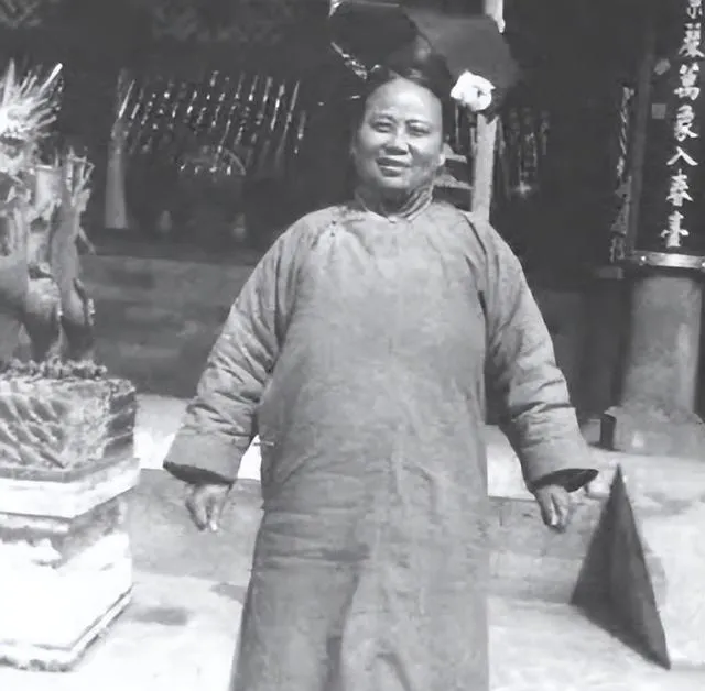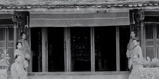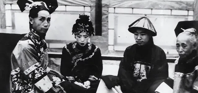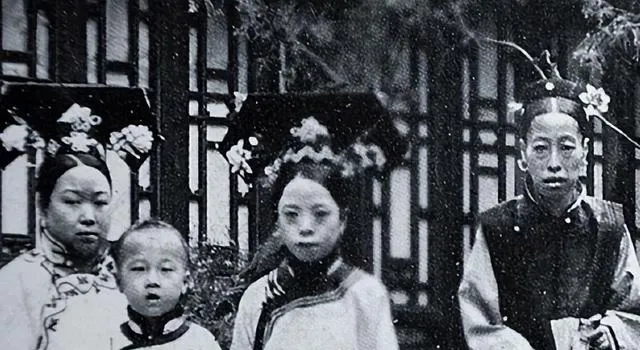 图中这排穿袍戴花的叫后宫合影,站位里前后有序,前排抱着扇子的人多,扇骨细密,头上大簪子压得稳,额前没什么笑,衣色偏素,边沿的滚边却做得细,老照片里看不见戏里那种油光水滑,反倒是风吹过门槛石时起的灰尘能想象出来,奶奶看过类似的影像说别看她们坐着不动,心里都有数,谁管谁,谁听谁。