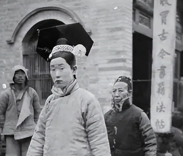 最后这张是街口过人的宫女,眉白粉重,头上黑翅子一压,身后两位看客探着身子,门洞的砖缝清清楚楚,像把时间钉住了,电视里常把她们抬得高高的,这里走在街上一样会被人看一眼又转头,各自忙活各自的,旧日子落在地上就是这般平常。