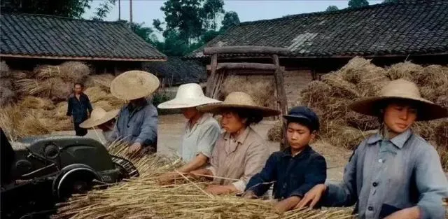这台子是脱粒机,草把子往里喂,铁皮壳子里头轰隆一响,谷粒像雨点子一样往下落,帽檐子遮不住灰,手背子一抖全是细糠,奶奶说以前没这玩意儿,全靠连枷拍,肩膀能拍酸一宿,现在机器一开,几家轮着干,天黑前就能收摊。