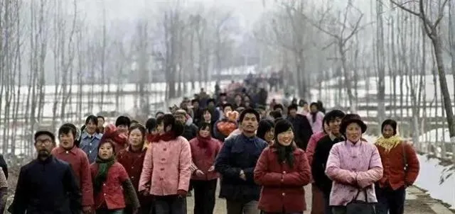 队伍这一溜是春游扫墓,棉袄子一色的红里透粉,路上泥还没化透,脚面蹭起一层白霜,大家肩并肩朝前走,嘴里唱着歌,旗子在前面杵着,风一来就飘一下,照片里没有车声,只有笑。
