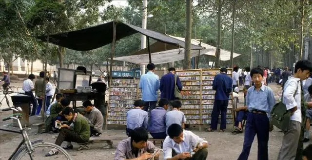 这个摊子就是小人书摊,一排排木架子插满了画册,几分几角的价码写在牌子上,老板手快,孩子手更快,一本翻到背脊起毛,二毛以下看一次一分钱,咱兜里摸来摸去凑出个两分,蹲在地上就不想走了,夕阳穿过树叶子滴滴答答照在封面上。