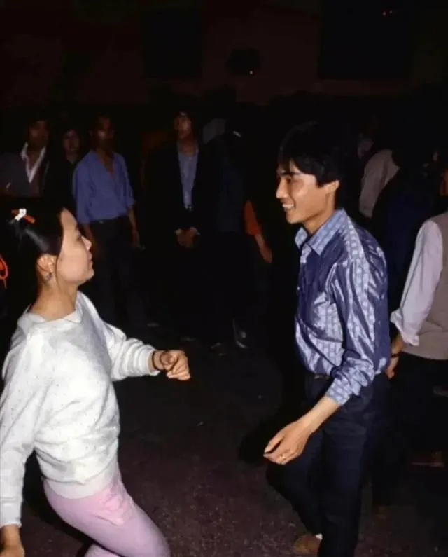 这张是迪斯科舞会,地板砖反着光,姑娘穿羊绒衫,男生衬衫上铆着细格,手往前一探,脚下打个节,磁带机里曲儿一换,人群里起了个小叫好,谁也不拿手机拍,跳完抹把汗笑一笑就散了。
