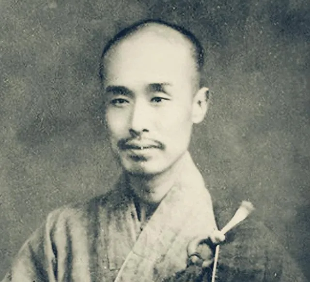 图中这位僧人叫弘一法师,身上僧衣素净,手里握着折扇,周围摆着几口花盆,叶片阔大,像刚浇过水,泥味儿往外冒,他脸上带着那种收住了的温和,眼睛在花叶之间停一停,像在打量也像在照看,耳边要是有风,估摸着扇子会轻轻一合,纸骨碰在一起那声脆响很细。