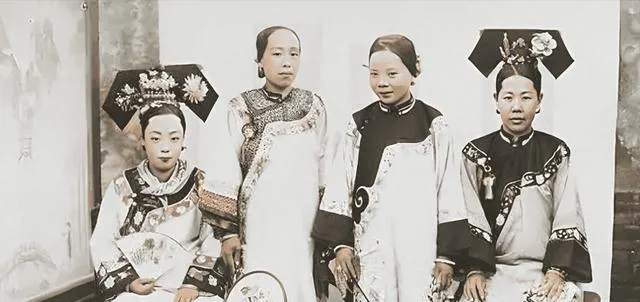 这个场面叫清末家族合影,绫罗罩着,袖口肥大,头上钗环一层叠一层,板凳排成一线,人坐得直直的,背景墙上藤蔓压住砖缝,镜头前谁也不笑,老照片里常这样,师傅喊一声别动,大家就把神气收住了,我奶奶说那会儿拍照是件大事,穿戴要体面,心也要稳。