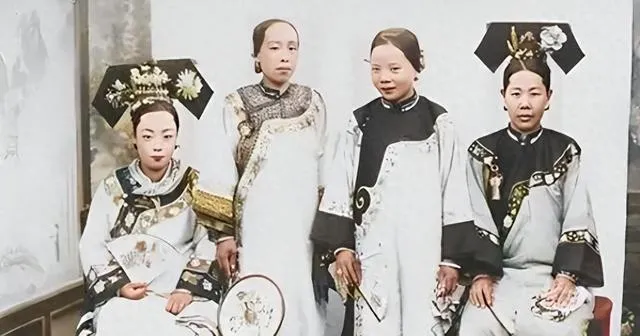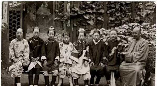 这个场面叫清末家族合影,绫罗罩着,袖口肥大,头上钗环一层叠一层,板凳排成一线,人坐得直直的,背景墙上藤蔓压住砖缝,镜头前谁也不笑,老照片里常这样,师傅喊一声别动,大家就把神气收住了,我奶奶说那会儿拍照是件大事,穿戴要体面,心也要稳。