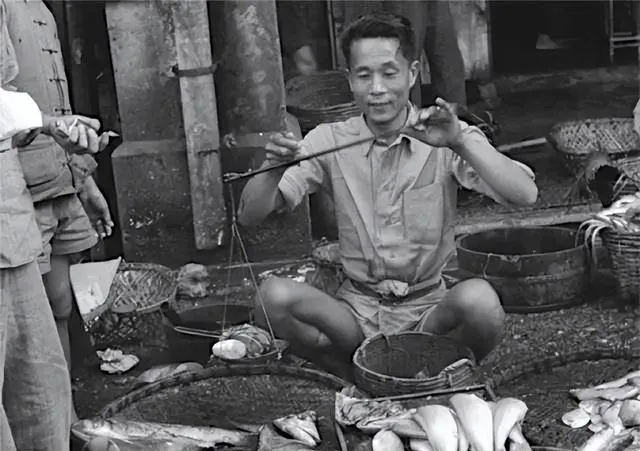图中这细长的杆叫杆秤,鱼贩两膝一夹,秤星一拨,砣子游到哪价就到哪,竹篮里还有水,鲫鱼翻个身溅到他衬衫上,他笑着说“少两钱我赔你一鳞”,我小时候站在地摊边看他抹秤杆的油,手心一抹就亮,回家学着掂筷子装秤,也就装个热闹。