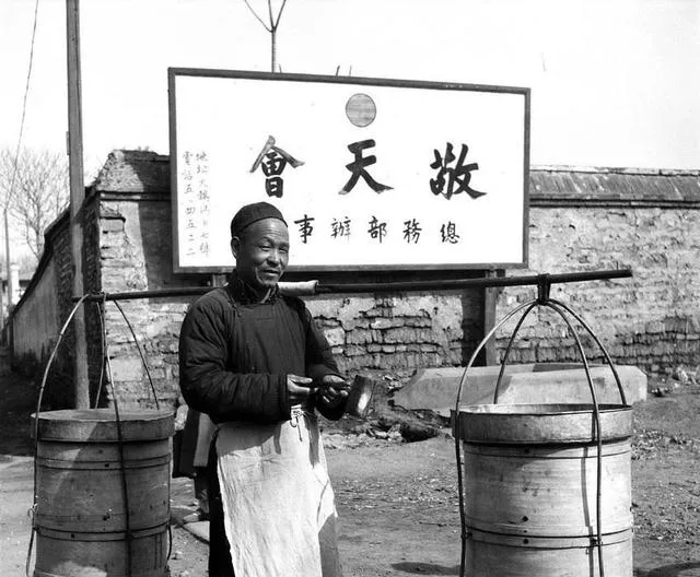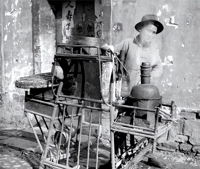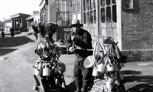 图中这位挑着的叫货郎担,竹竿上坠着小铜铃布条和零碎家什,梳子针线扣子香粉小镜子串成一片,人一到胡同口铃一响,主妇们手里还沾着面就出来挑拣,嘴里嘀咕一声“便宜点行不行”,货郎笑一笑,秤砣往上一挪,日子就这么抹开了一道缝。