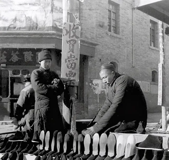 这是布鞋摊,前头一溜黑面鞋帮子端得齐,师傅把鞋底一压,麻线从指缝里钻过去,针尖在阳光里闪一下就没了,妈妈说旧时候过年能换双新底鞋,脚上就算有盼头了,现在商场亮堂,做工却未必比这手里的密针更结实。