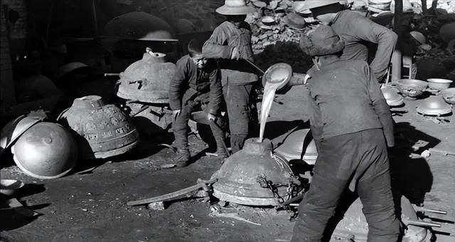 这张是浇铸铁锅,铁水白得刺眼,从大勺里顺着咽口进模,旁边人喊一声稳着,脚下全是砂模半壳,空气里都是铁锈味和焦砂味,等冷下来咣当一开,锅坯落地,这玩意儿后来端在千家万户的灶头上,滚水、煎饼、焖菜都靠它顶着日子往前推。