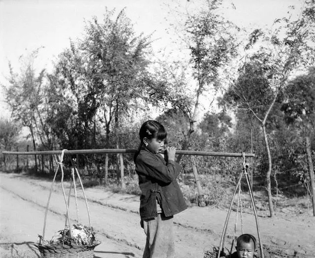 图中这担子叫扁担,一头蔬菜一头娃娃,女孩脚上裤腿打着补丁,肩窝里压出一道深痕,她不哭不闹,抬眼看前头的土路,风把发梢吹得乱,妈妈看见这张图只叹一句“那时候日子真苦”,现在娃娃上学有车坐,有热饭吃,路却也更急了。