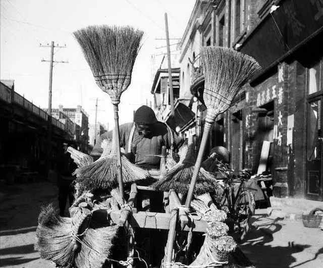 这堆得跟小山一样的还是刷帚货车,窄街里人力车、自行车绕着它过,老板埋着头理绳子,我顺手摸一把苇穗,扎手却结实,旧北京的街有味道,冬天的阳光斜在门匾上,灰尘在光里转,声音混在一起,吆喝、车铃、脚步,像今天的早高峰但没那么快。