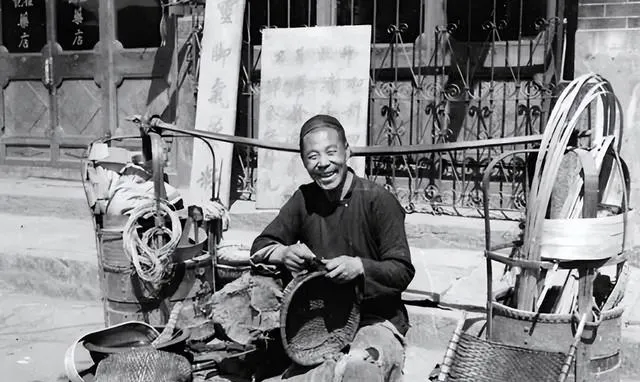 图中这位正编的是柳条筐,细条子在指尖盘来绕去,口子收拢严丝合缝,他笑得亮,背后门板上贴着小广告,写着修篮修席,奶奶说好手艺的人饿不死,穷年月里就靠这一双手,一根根把日子编紧,不让风从缝里灌进去。