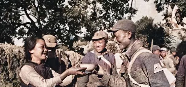 这场面叫拥军送茶,碗口不大,盛的却是热乎劲,女同志笑得敞亮,手上还捏着条布,战士伸手去接,背上绑着绑带和干粮袋,一旁人看着乐呵,小时候我在村口看过戏台子搭起来,台下也就这股子闹猛,现在活动一搞喇叭喊半天,少了这种贴身的热度。