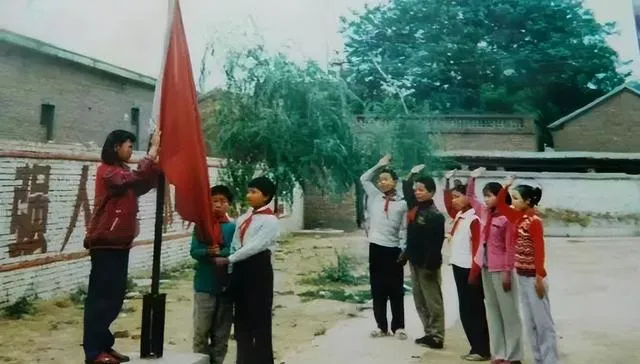 图中这块红旗杆旁的小仪式叫升旗,黑铁底座沉甸甸的,旗杆直直地立着,布一拽起来就抖成一条火苗,队里同学围着站一排,戴着红领巾的把手举得笔直,口号一喊气都跟着足了,早上风凉,旗边擦到脸上有点扎,我当时总偷瞟角落里的朋友,谁要是笑场,回教室路上得被同桌轻轻撞一下。