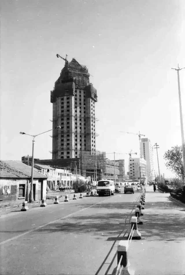 1997年,盐城农行大楼正在建设中,是当时盐城的第一高楼。照片来源:俞文鸿。